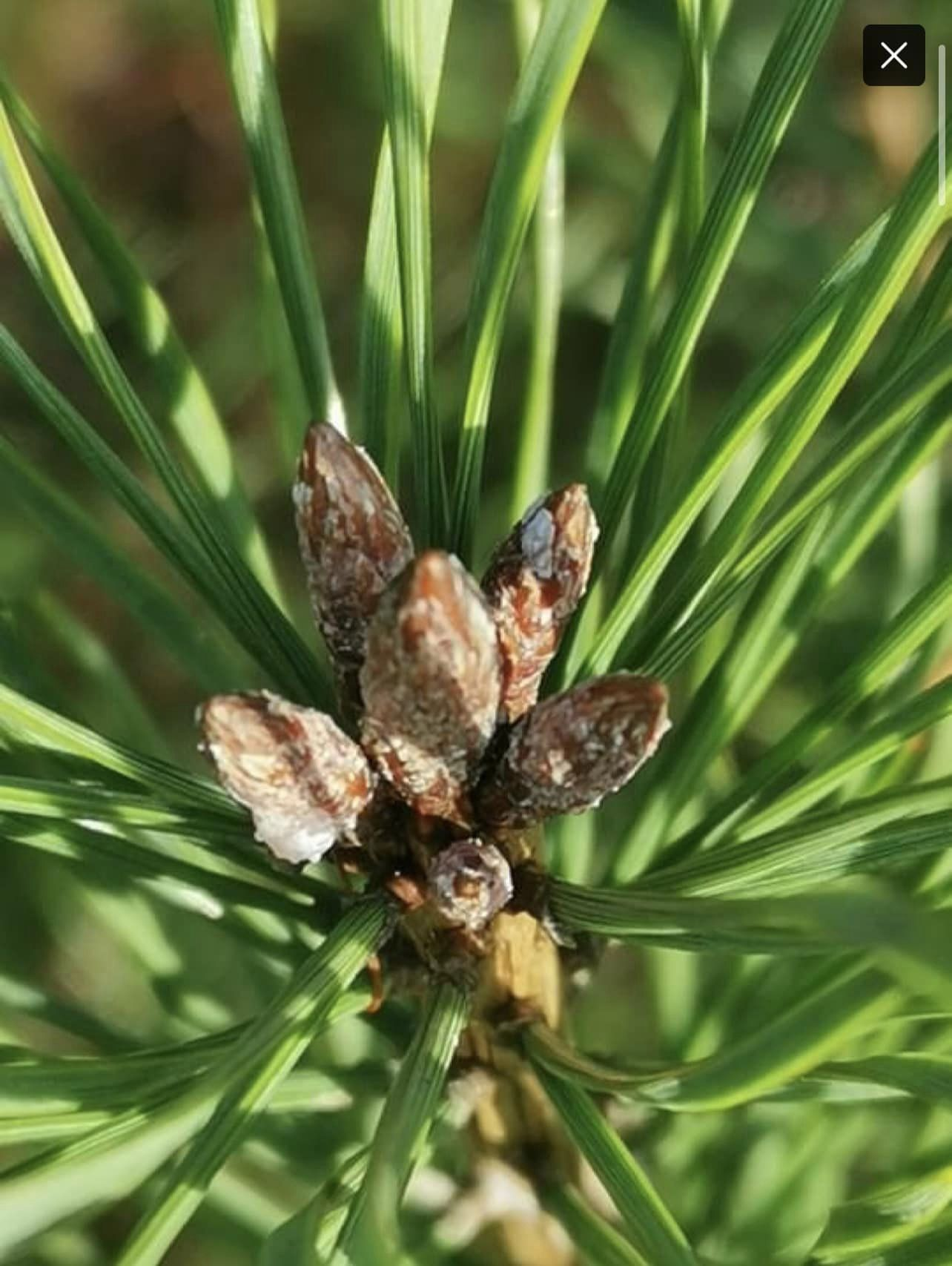 Kleur Blauwgroene naalden (telkens in groepjes van 2) en roodbruine schors bij volwassen bomen