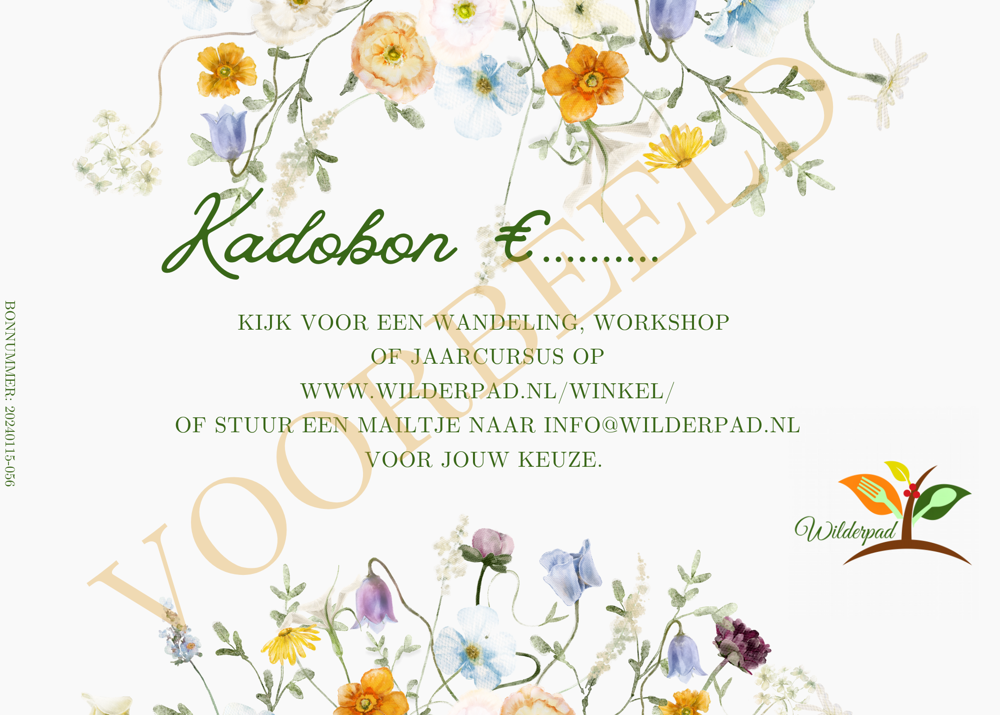 Een cadeaubon die de ontvanger meeneemt naar de betoverende wereld van de natuur. Een wereld waarin ze leren hoe ze wilde planten kunnen verwerken, smaakvolle likeuren kunnen maken, en zelfs hoe ze zelfvoorzienend kunnen leren leven. Een plek waar wandelen, workshops, lessen en cursussen een diepe verbinding met de natuur.